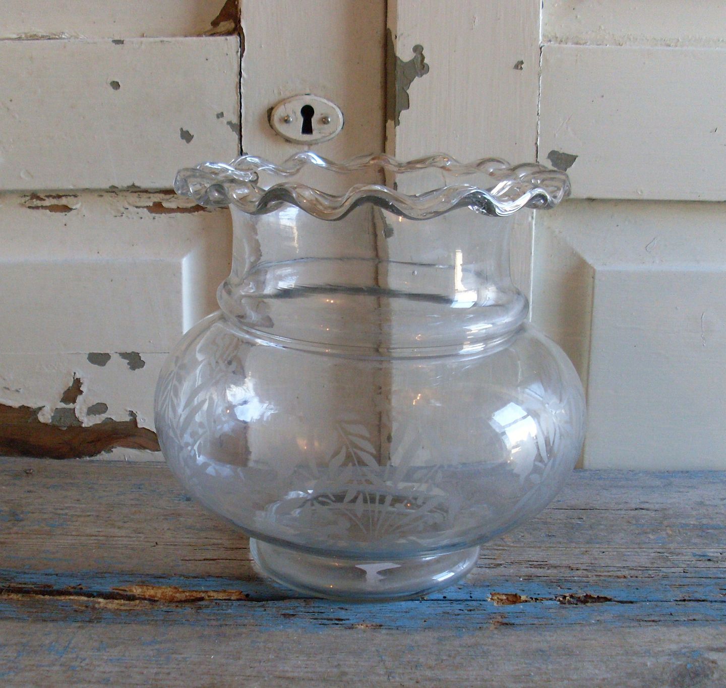 Smukt tysk 1800tals fiskeglas med bølget kant og ætset dekoration.