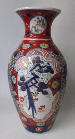 Imari vase, 19. årh. Japan. Polykrom dekoration med cobolt blåt, forgyldninger, rødt m.v. Medaljoner med træer og ho-o fugle. H.: 25 cm. Virkelig pænt eksemplar.
