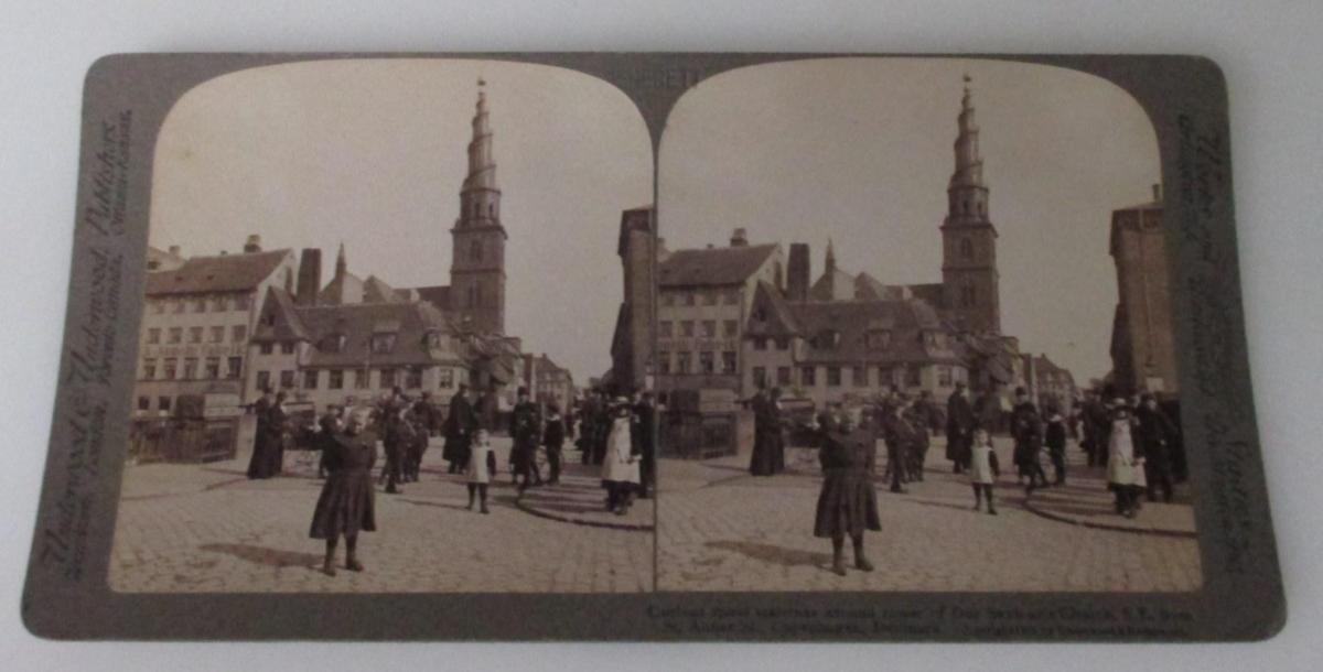 Kæmpe samling stereoskopiske fotos fra hele verden. 1905. Dette foto viser Vor Frelsers Kirke i København og St. Anna Plads. 1905. Copyright: Underwood & Underwood. Pris pr. stk.