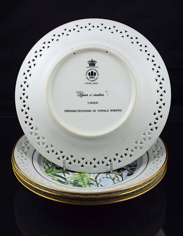 4 stk platter af Bing og Grøndahl med motiv af Djur i natur/ dyr i natur. Motiverne er efter Harald Wiberg og platterne er med intakt gylden kant. De er fra 1. sort og i meget pæn stand.