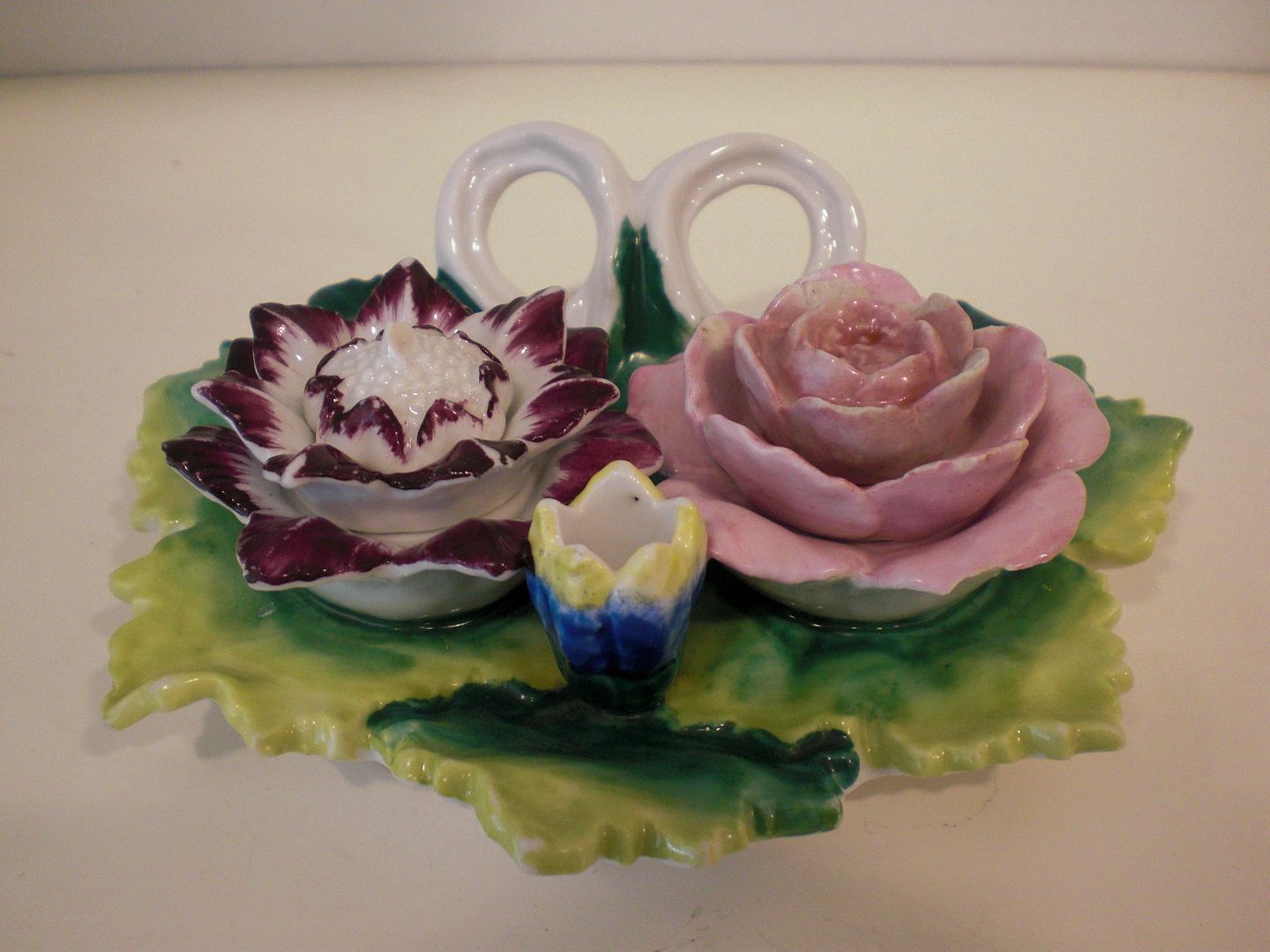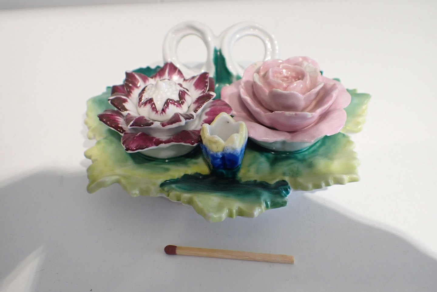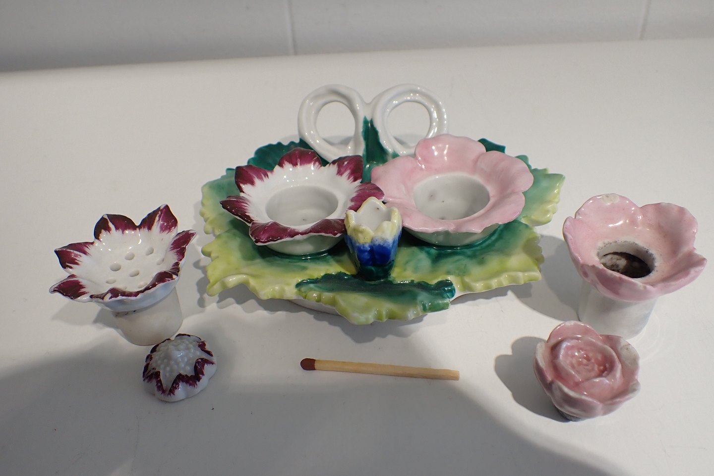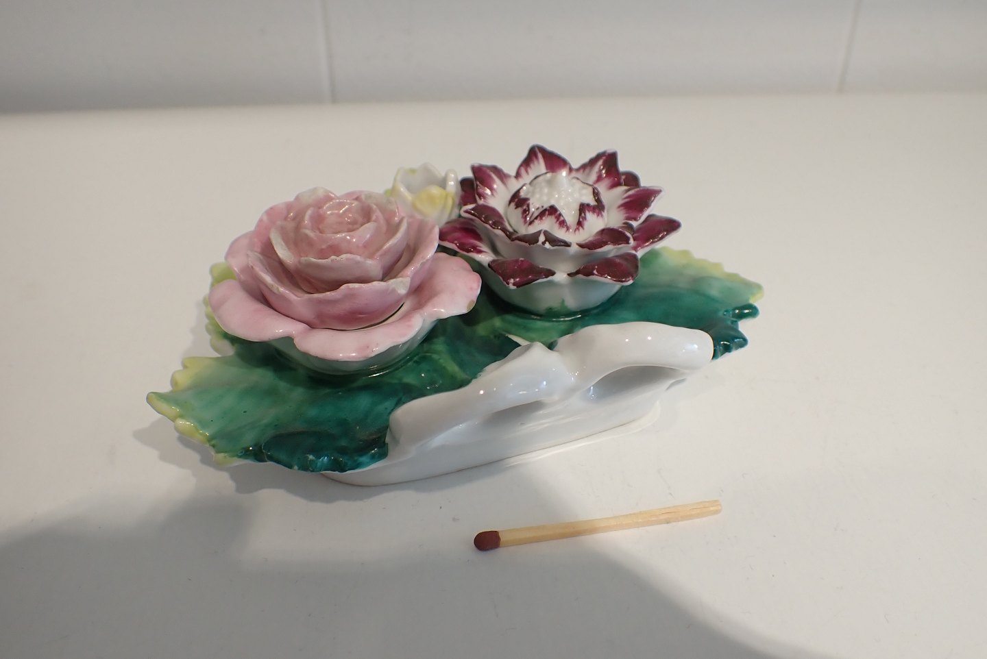 Blækhus og sanddåse lavet som blomsterdekoration i porcelæn. Tysk 1800-tal. Ustemplet. Der er lidt kantafslag på det lyserøde låg. Længde: 13 cm. Bredde 11 cm.