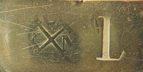 Rivejern i messing, 19. årh. Stemplet: Kobbermøllen ved Flensborg. Med perforeret, opbuet messingplade oplagt på messingbøjle. L.: 34 cm. B.: 12 cm.