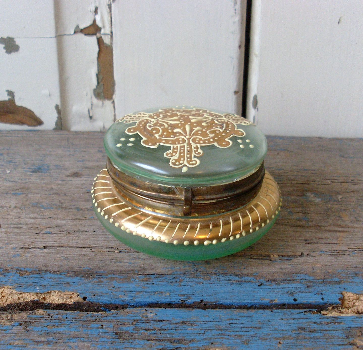 Smukt glas skrin med guld dekoration.