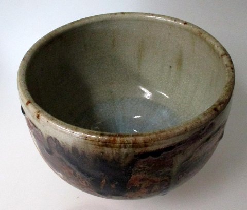 Walther, Conny (1931 - ) Danmark: Bordskål. Stentøj. Indvendig grå glaseret. Udvendig grålig og brunglaseret. H.: 14 cm. Dia.: 18 cm. Stemplet.