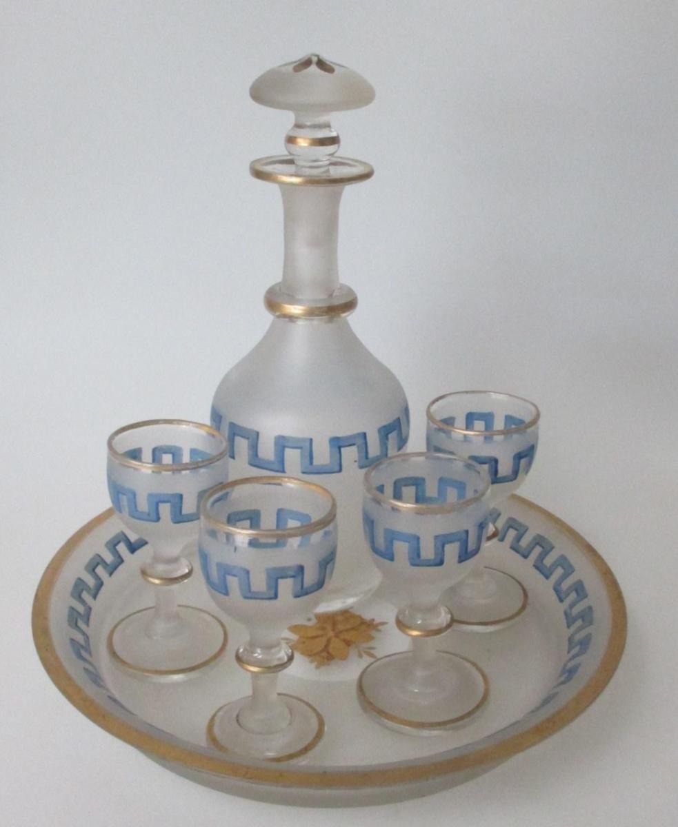 Tysk likør sæt i matteret sandblæst glas, 1003. Med forgyldning og bemalet bort. Bestående af bakke, 4 snapseglas og lille karaffel med prop. Højde karaffel:: 16,5 cm. Dia. bakke: 17,5 cm. På bakken label, hvor det er anført, at bakken er givet den 18. maj 1903.