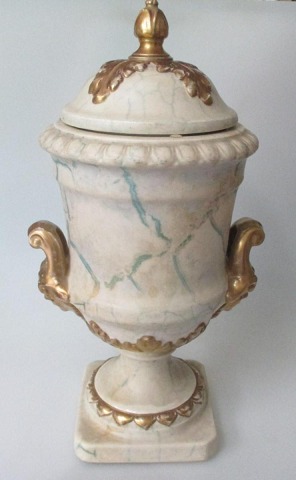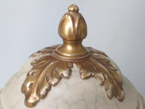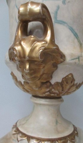 Vaseformet prydvase med låg, fajance, marmormeret med forgyldninger, 19. årh. Antagelig Tyskland. Hanke i form af maskeroner. H.: 35 cm. I bunden produktionsnummer: 86.