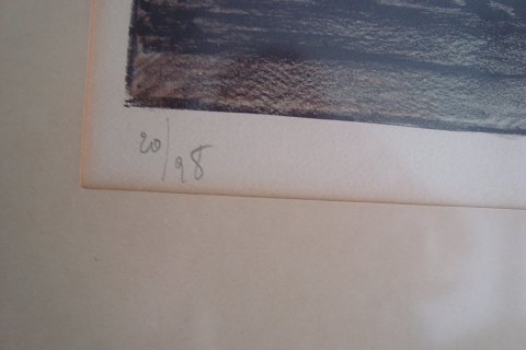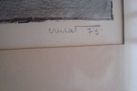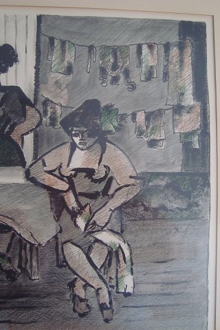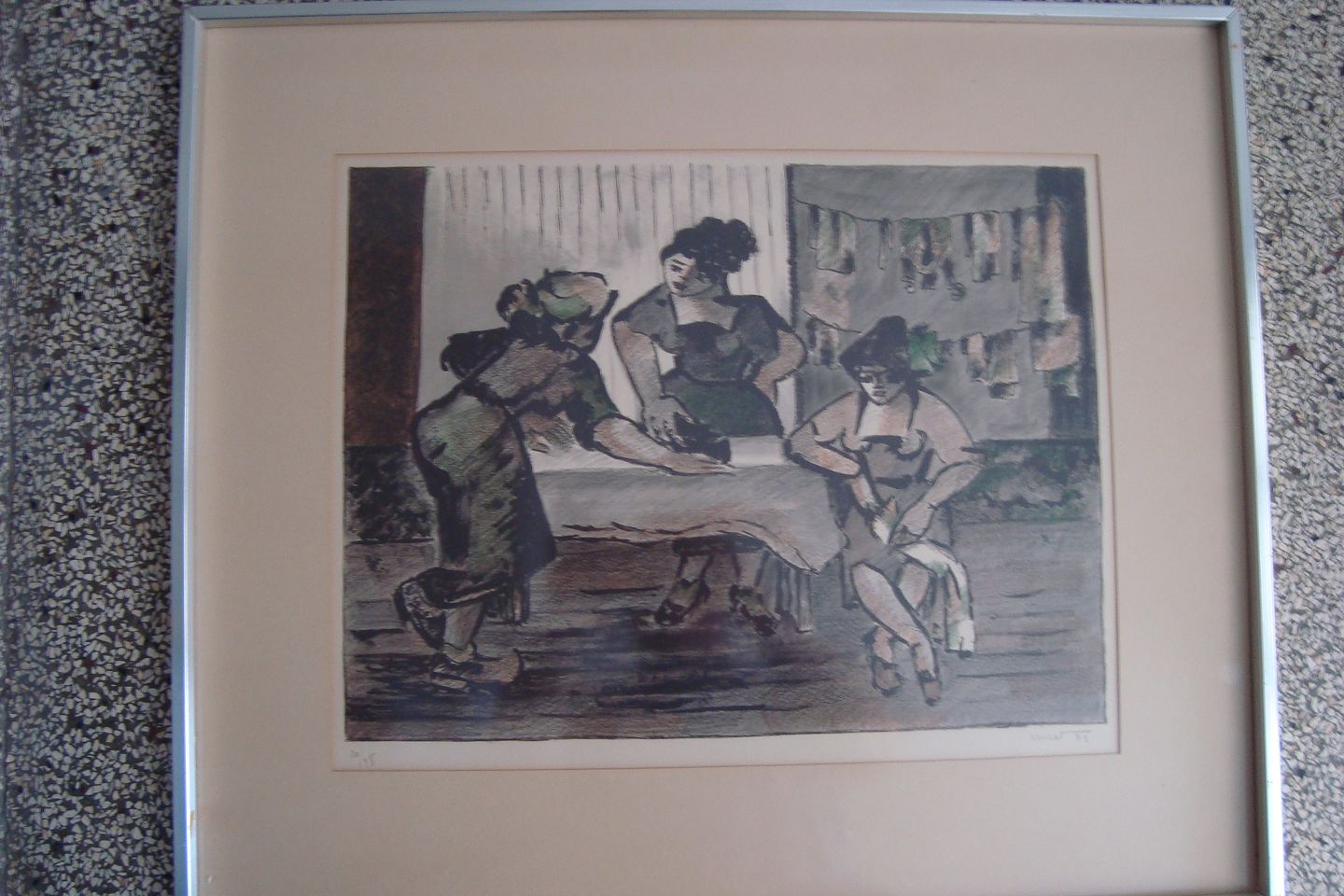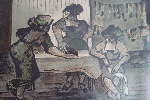 Farvelitografi af den franske kunstner Roger Crusat 1973 - Scene fra vaskeri/rullestue.