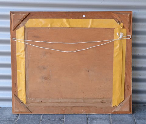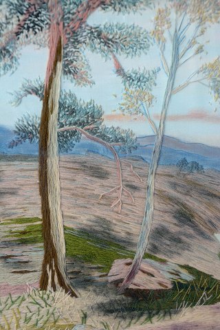 Landskab - maleri og broderi på stof. Monteret på træplade. Usigneret. Pæn stand.