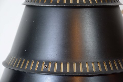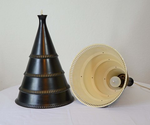 2 stk. loftspendler af Knud Hjerting Sortmalet metal med lys inderside. Produceret ved Lyfa, model 208, bemærk 4 lag, findes i mindre model. Lamperne er i pæn stand. Kræmmerhus form