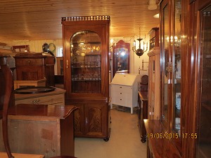Stor salgsudstilling med restaurerede møbler håndpolerede mahognimøbler, afsyrede fyrretræsmøbler, malede træmøbler, kun originale gamle og antikke møbler.