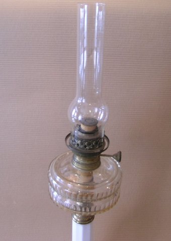 Heiberg olielampe, hvidt opalglas med original brænder, olieglasbeholder og lampeglas. Danmark ca. 1900, h: 57 cm