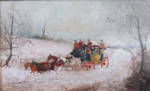 Rideout, Phillip Henry (1860 - 1920) England: En postvogn med personer. Olie på pap. Signeret.: Monogram. 15,5 x 23,5 cm. Med ramme.