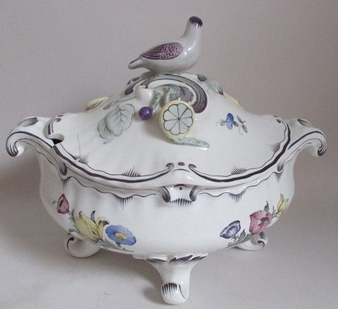 Låg terrin i fajance, Rørstrand, Sverige, 20. årh. Polykrom dekoration i overføringsteknik. Dekoreret med fugl, blomster og frugter. Låget er defekt - limet. Terrinen perfekt stand. Stemplet.: Rørstrandia, Rørstrand, Made in Sweden. L.: 36 cm. H.: 39 cm.