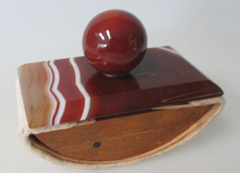 Brev presse, 1900. Udformet i agat. Med rund agat som håndtag. L.: 8 cm. B.: 4,5 cm. H.: 6 cm.   Flot stand.