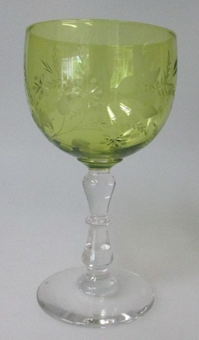 Hvidvins glas med lysgrøn kumme, 20. årh. Med slibninger på kumme. H.: H.: 13,2 cm. Antagelig Tyskland.