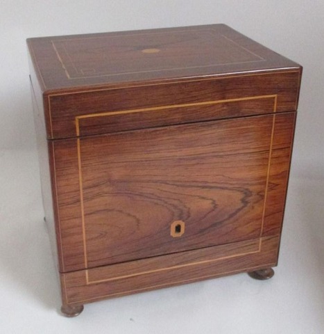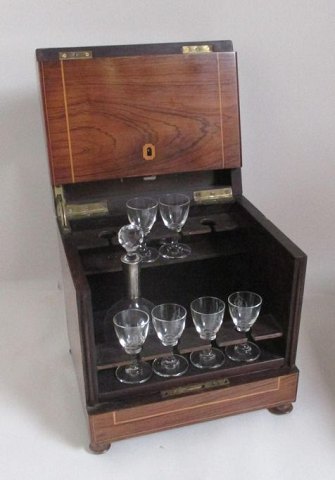 Liqueur cabinet, England, 19th century. Rosewood with marquetry. With openable top. With decanter with silver mounting and 6 glass engraving: B - for Bestle. 25 x 26.5 x 20 cm.