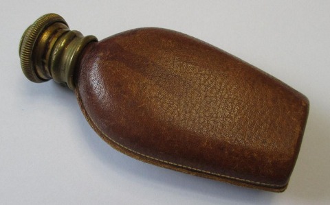 Parfume flacon. 19/20. årh. England. I klart glas. Udvendig foret med læder med guldtryk. Låg i messing. L.: 9 cm.
