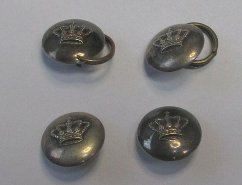 4 vest knapper i sølv med kronge krone. Danmark. Dia.: 1,5 cm. Ustemplet.  Proveniens.: Familien Qvistgaard.