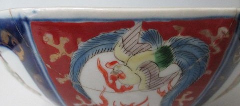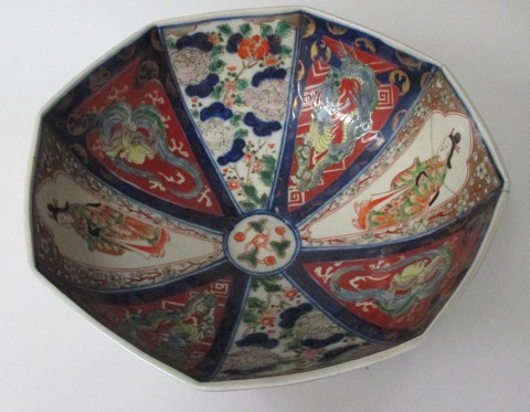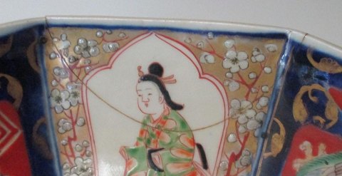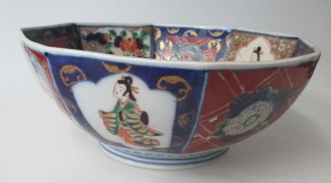 Japansk Imari skål, 20. årh. 8 kantet. Polykrom dekoration på inder- og yderside med blomster, mennesker i kimono og Ho-o fugle. H: 9 cm. Dia: 21,2 cm. Signeret. Limet.