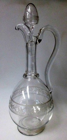 Vin kande i klart glas, 19. årh. Med slibninger og hank. H.: 32 cm. Med prop.