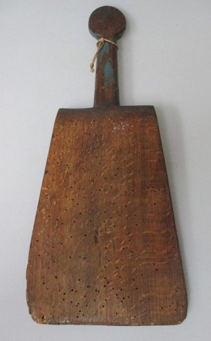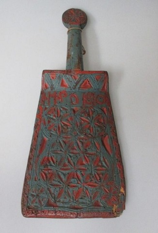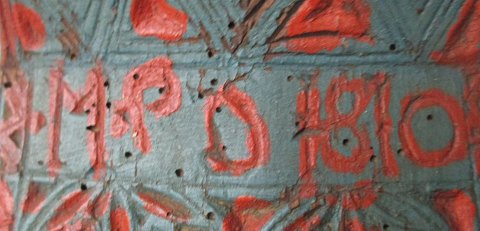 Banketærskel.1810, Danmark.  Udskåret og bemalet bøgetræ. Med navnetræk: MPD 1810. L.: 35 cm. B.: 14 cm.