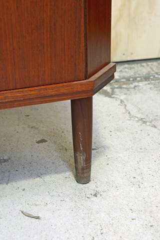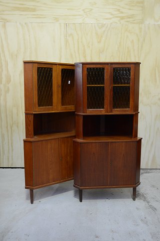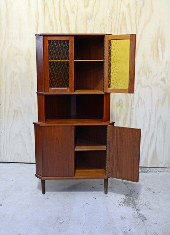 Hjørneskab i teak med mønstret ruder. Brugsspor.