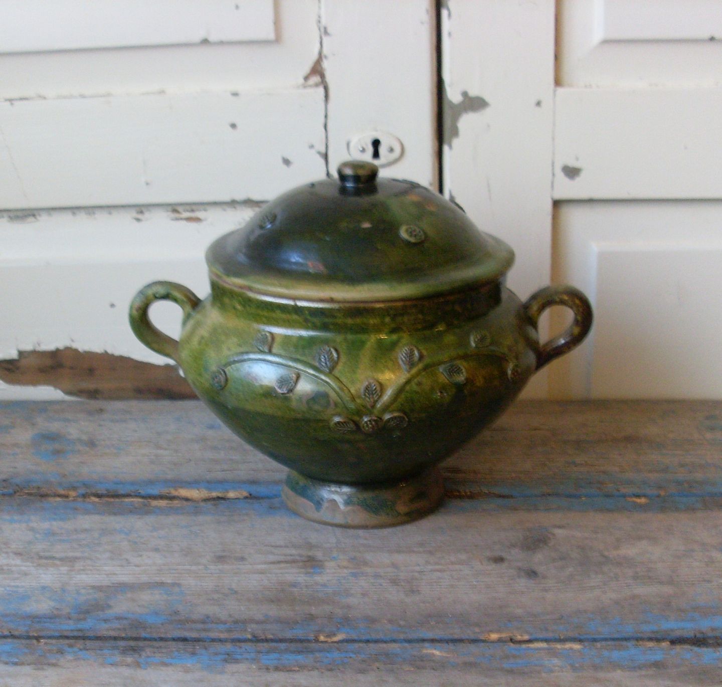 Grønglaseret terrin fra Skotterup, dekoreret med modellerede blade.