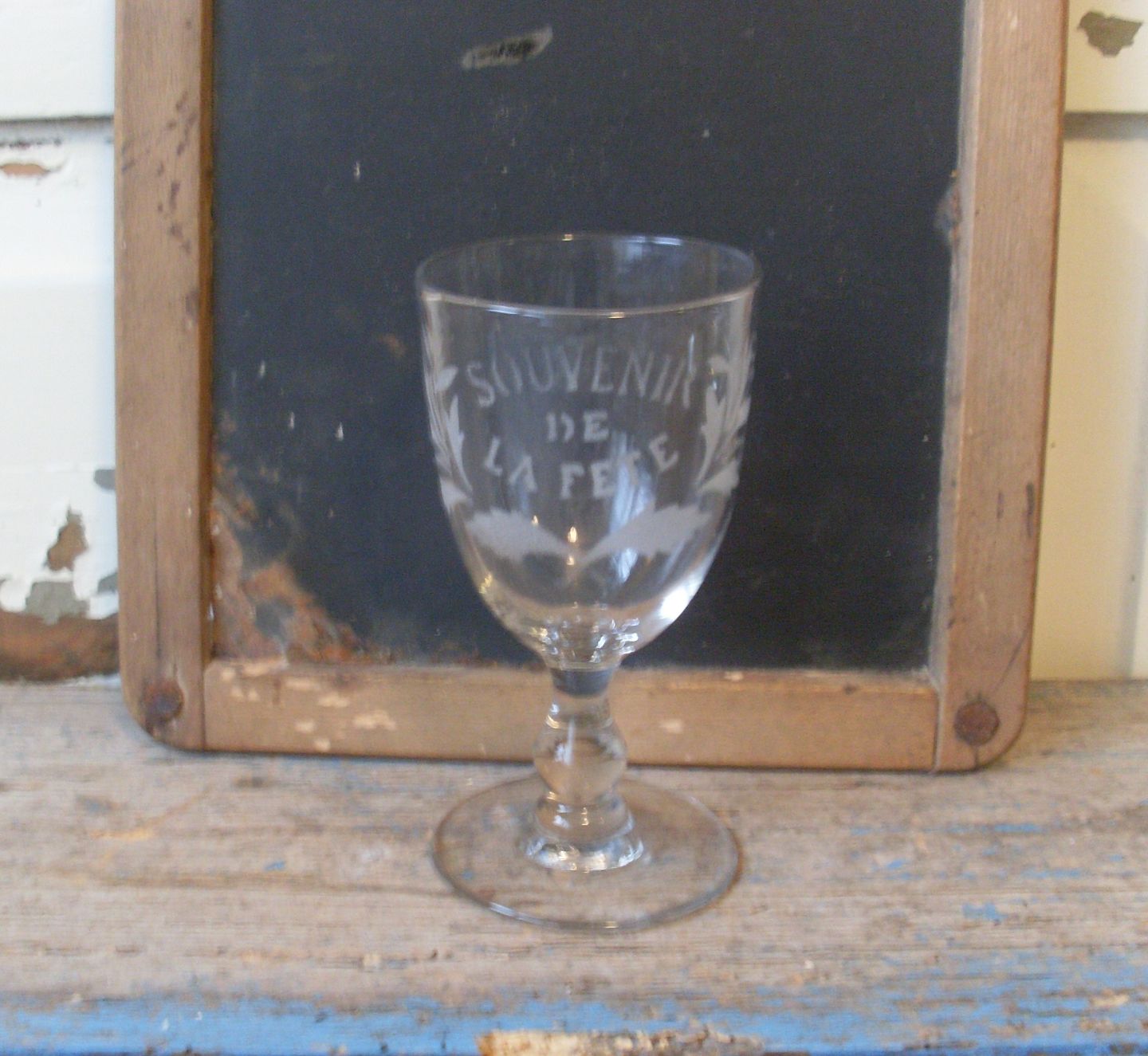 Gammelt fransk vinglas med ætset dekoration samt teksten "Souvenir de la fete" 13,5cm.