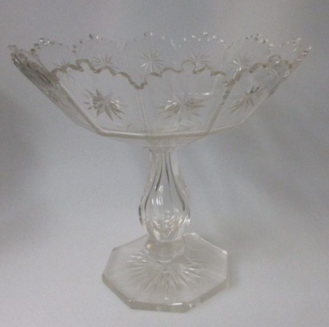 Glasopsats, klar glas, o. 1900. Danmark. Med 8 kantet fod og 12 kantet skål. Med slibninger. H.: 22 cm. Dia.: 23 cm.