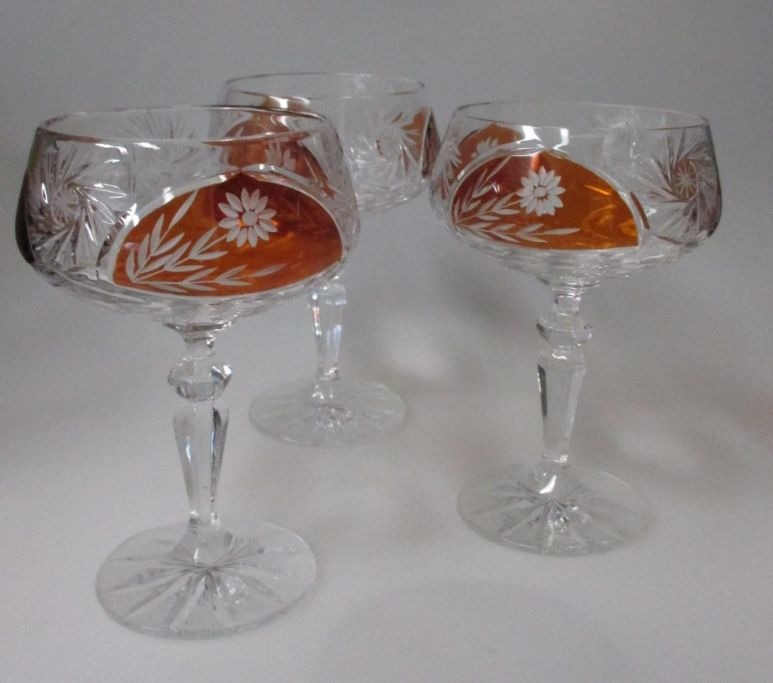 6 Champagne kummer, 20. årh., klart krystal glas med slibninger i den gule overfang. H.: 15 cm. Dia.: 10 cm.