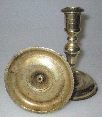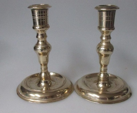 Par danske barokstager, 18./19. årh. "Næstved stager". Rund fod og profileret stamme. H.: 12,5 cm. Ustemplet.