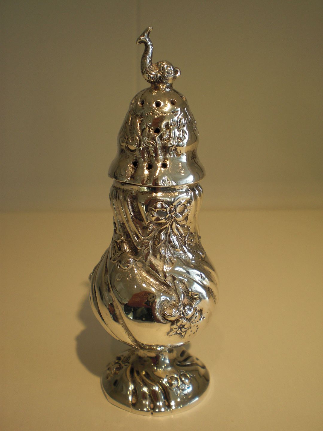 Peberbøsse med delfin på toppen og nyrokokko dekoration i 830 sølv uden mestermærke. Slut 1800-tal formentlig tysk. Højde: 11 cm. Fin stand.