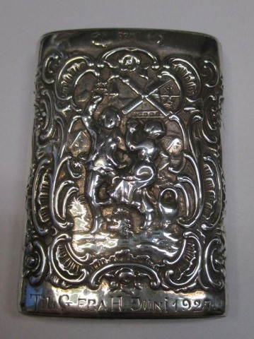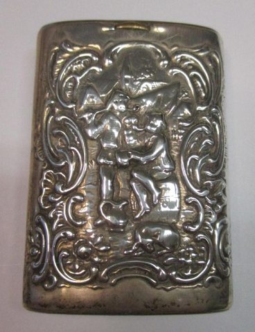 Tændstikholder i sølv, Holland. 20. årh. Med rococo dekorationer af dansende og rygende. Stemplet: 830. 6 x 4,5 cm. Med indgravering fra 1927.