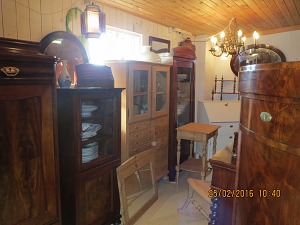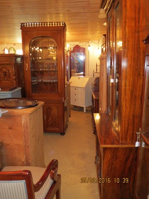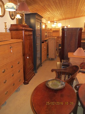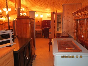 Stor salgsudstilling med restaurerede møbler håndpolerede mahognimøbler, afsyrede fyrretræsmøbler, malede træmøbler, kun originale gamle og antikke møbler.