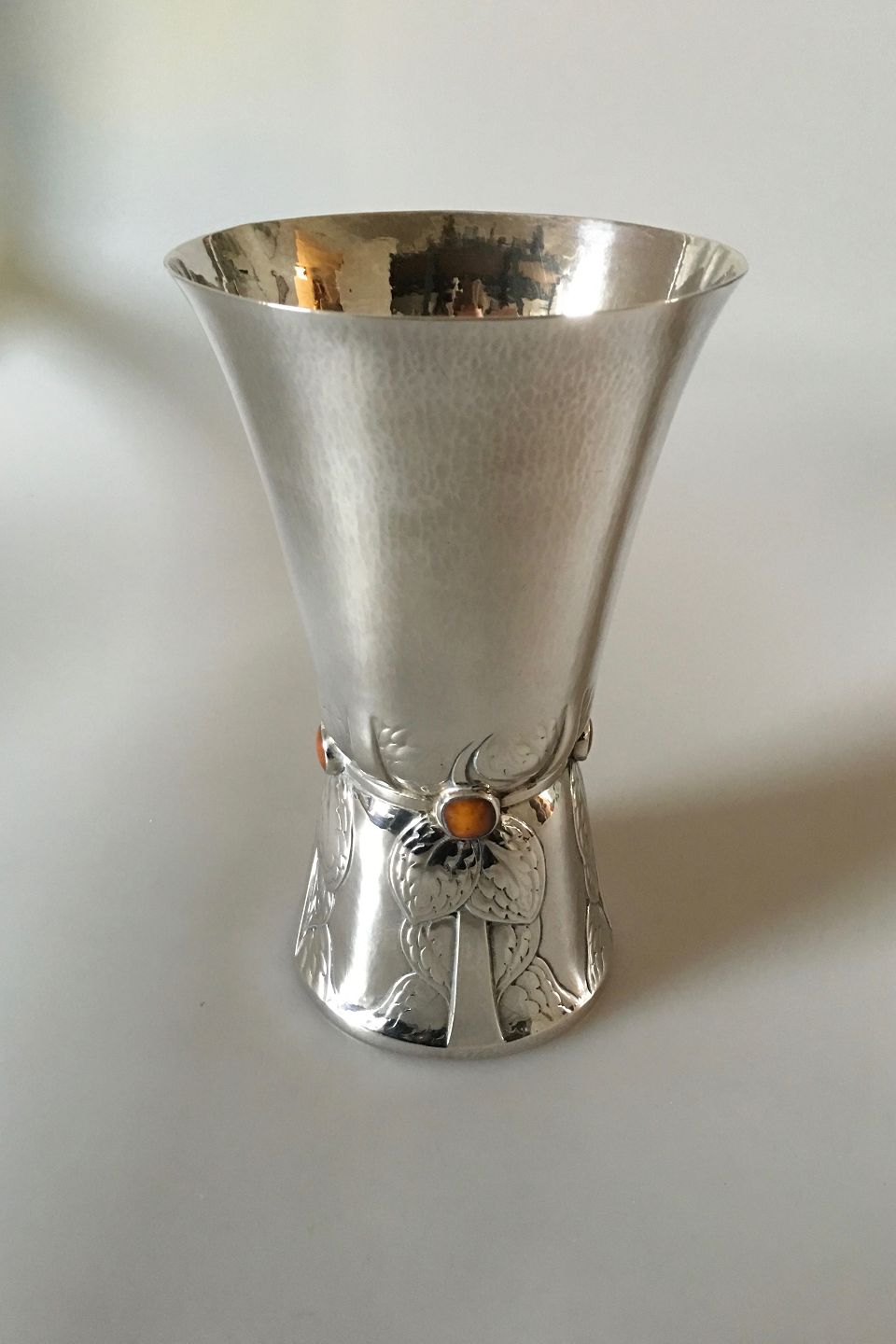 Georg Jensen Sølv Vase med Ravsten No 116. Vasen er prydet med bladmotiv og fire ravsten. Fra 1915-1920.
