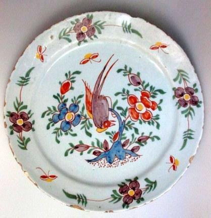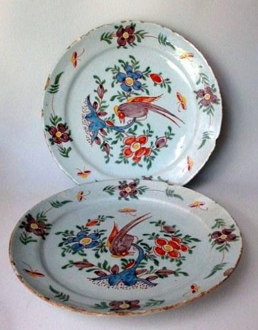 Par fajance tallerkener, Delft, Holland. Mester: Pieter Lievemsz van Dalen 1722 - 1734, der ejede værkstedet "De Vergulde Boot" (Den gyldne Båd) mellem 1722 og 1727 i Oude Delft. Grå/grøn skærv med polykrom dekoration i form af fugl i en busk. På fane blomster og sommerfugle. I "den japanske stil" fra 1680 - 1725. Dia.: 23 cm. Værkstedet eksisterede fra 1612 - 1774. Begge tallerkener har afslag på kanten. Signeret med: P Prisen er pr. stk.