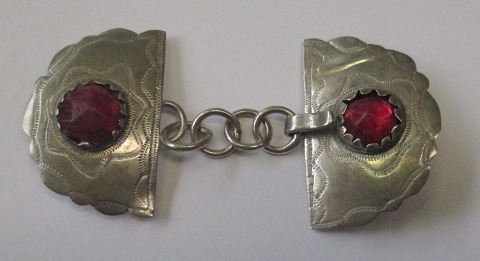 Antikt kåbe spænde i sølv med glasflusser og dekoration, 19. årh. Danmark. Mester: Rasmus Henrik Tvenstrup (1809 - 1893) Randers. Stemplet. L: 7,5 cm.