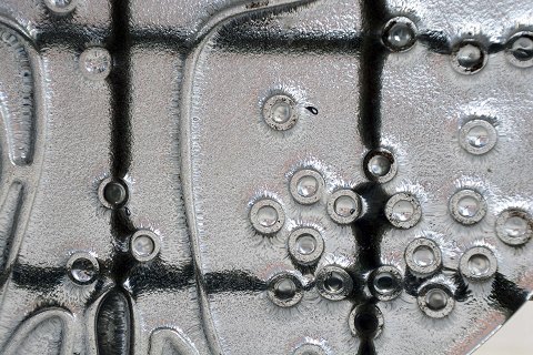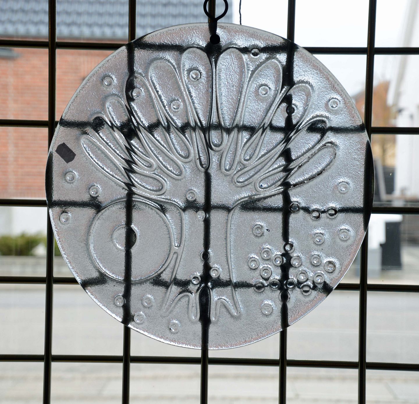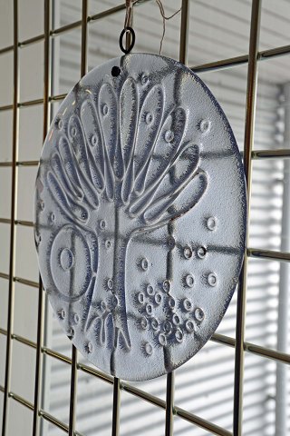 Relief i glas fra Holmegaard. Ophænget er fremstillet i glas i en gråblå nuance. Det er intakt.