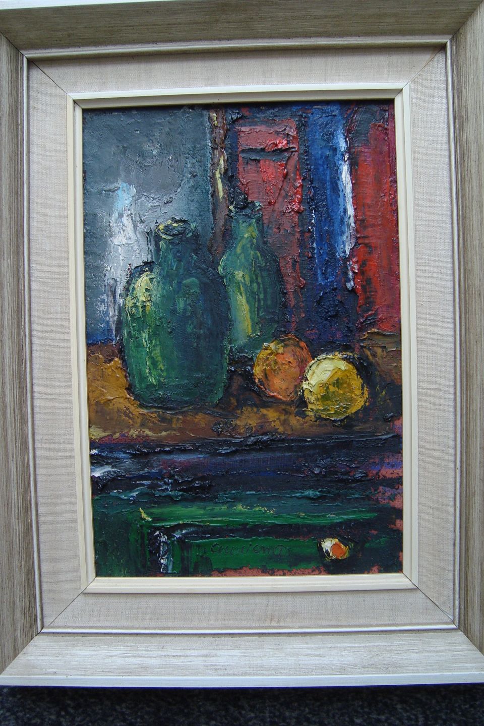 Maleri - Opstilling med flasker og frugt af Adelbert Winther Venø.