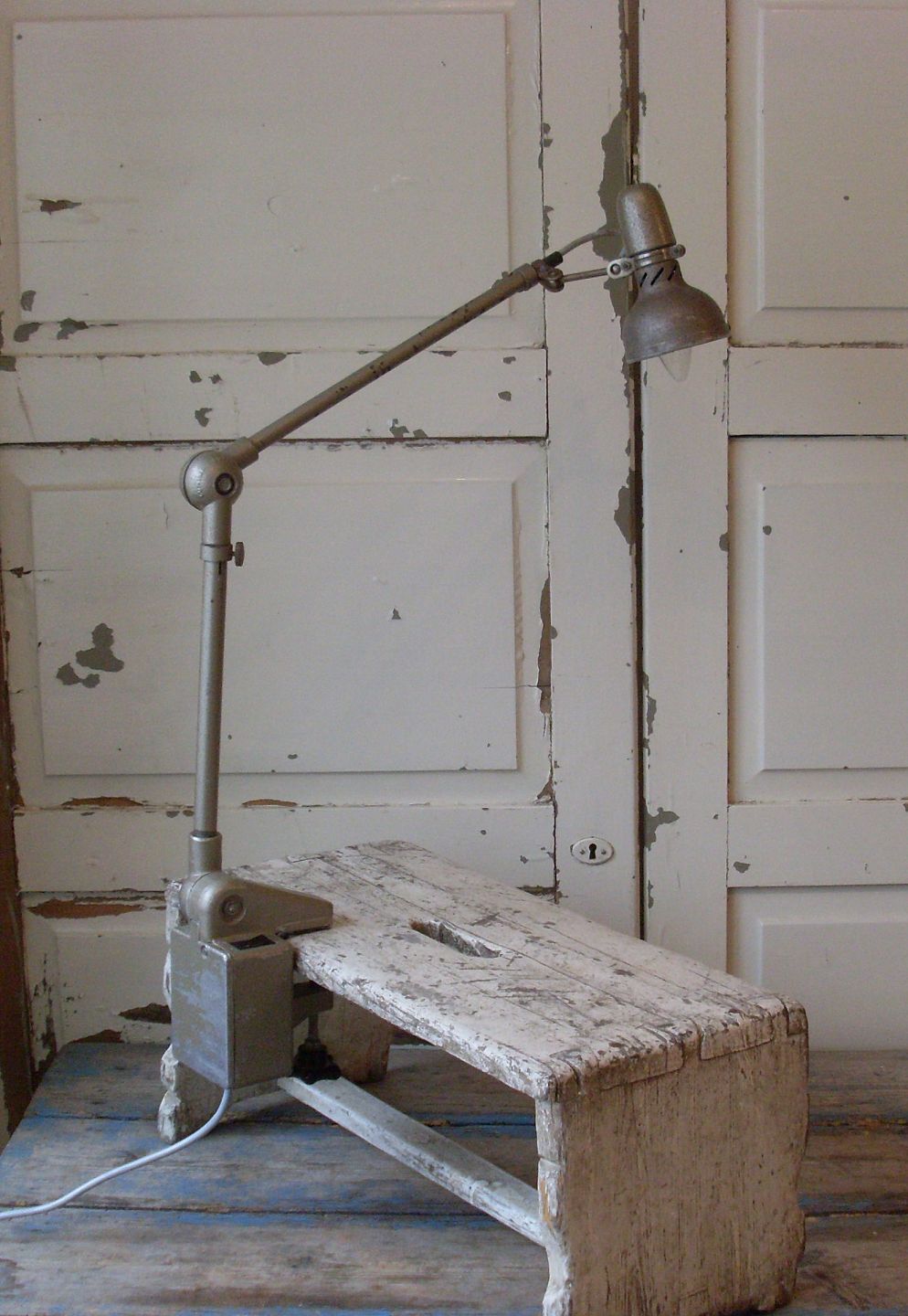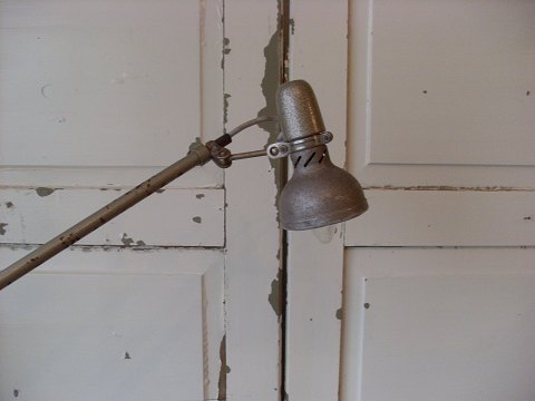 Industriel arbejds lampe, lampen kan justeres i højde, selve lampehovedet kan også reguleres på flere måder.