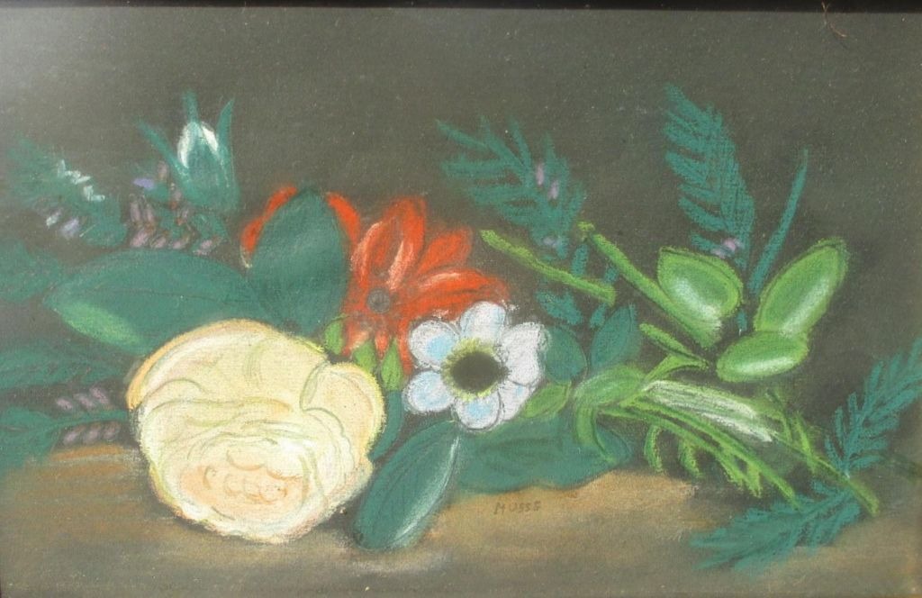 Dansk kunstner (19. årh.): Blomster på et bord. Pastel på papir. Signeret: Musse. 12 x 20 cm. I en forgyldt ramme.