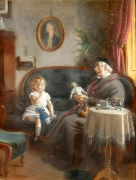 Schiødte, Valdemar Harald Immanuel (1852 - 1924) Denmark: Genre scene with the girl and sleeping. Pastel on paper. Signed .: H. Schiødte. 65 x 50 cm