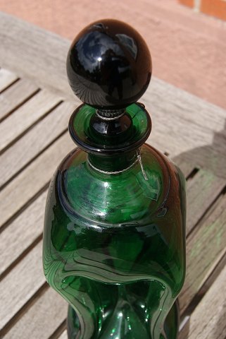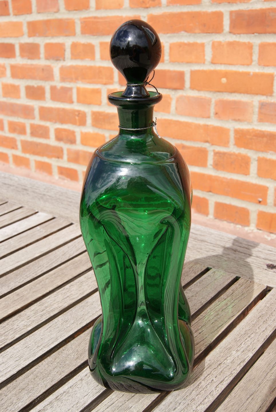 Karaffel eller klukflaske i mørkegront glas med påsat hals, fra dansk glasværk og fra omkring år 1900.
