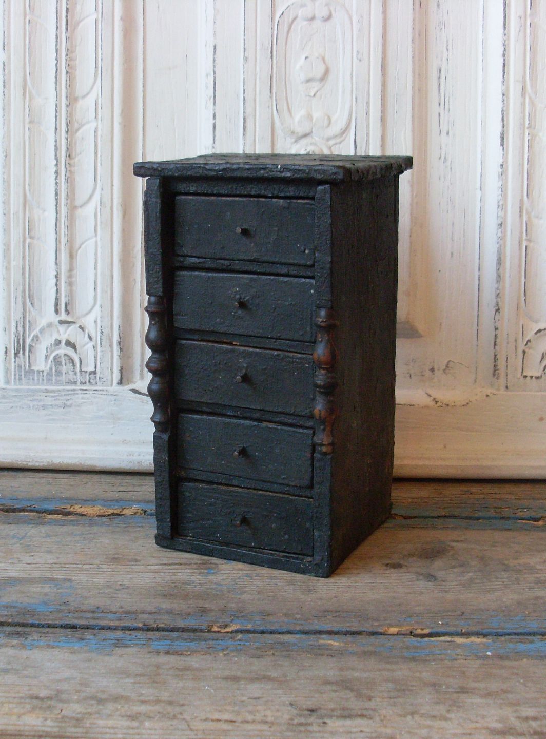1800tals svensk sort malet krydderiskrin med fem skuffer.