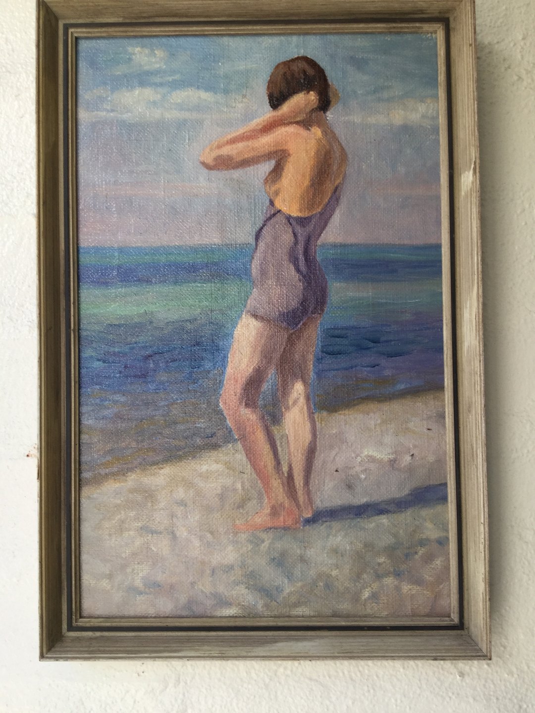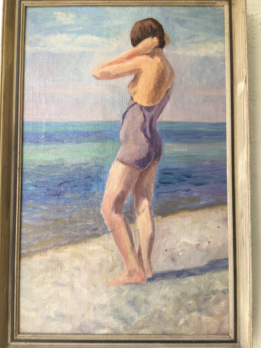 Maleri af Otto Woldbjerg Nielsen - badenymfe på strand med blottet bryst.