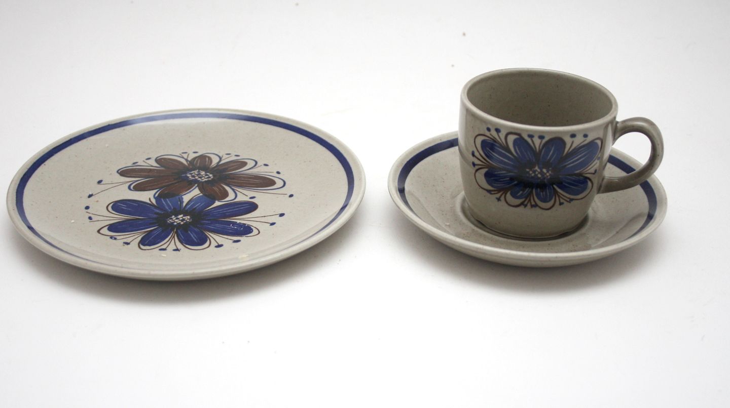 Stavangerflint/Figgjo, Norway, Florry stel med blomster på grå bund med blå kant. Designet af Nils Aarrestad Sivertsen omkring 1960. Fin stand.