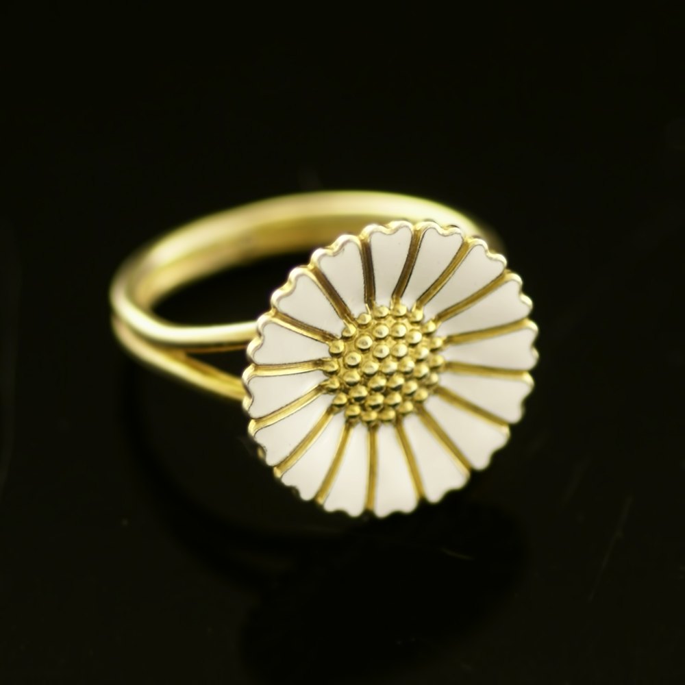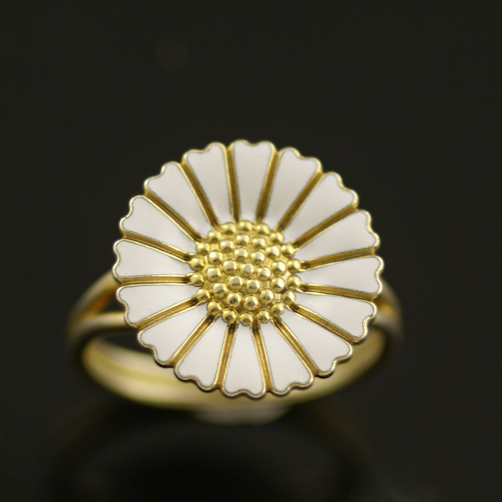 Bernhard Hertz. Marguerit / Daisy Ring i forgyldt Sterling Sølv med hvid emalje. 18mm