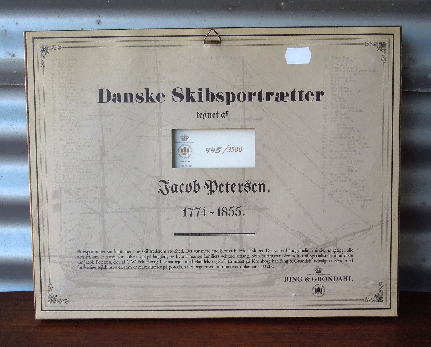 Dansk skibsportræt tegnet af Jacob Petersen 1774-1855. Reproduceret på Bing og Grøndahls porcelæn platte. Numereret 445/3500