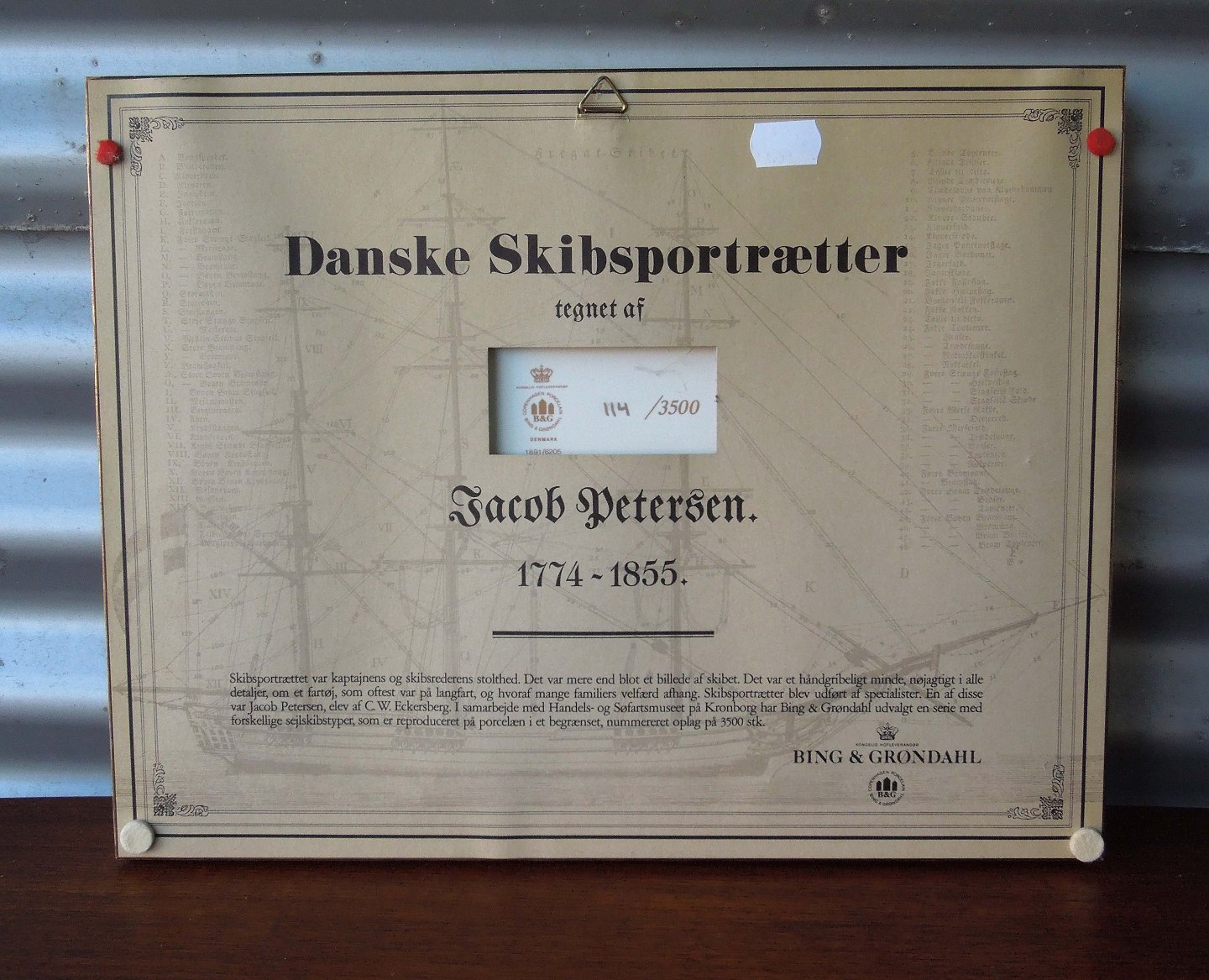 Dansk skibsportræt tegnet af Jacob Petersen 1774-1855. Reproduceret på Bing og Grøndahls porcelæn platte. Numereret 114/3500