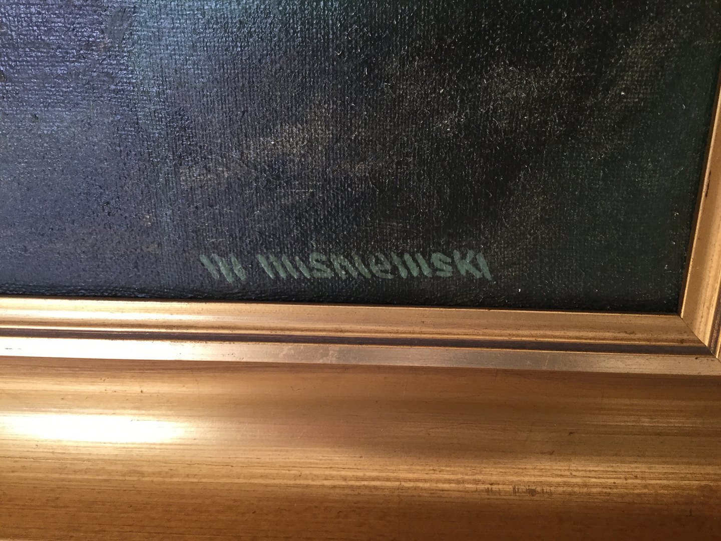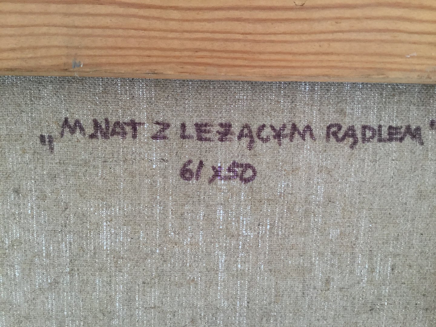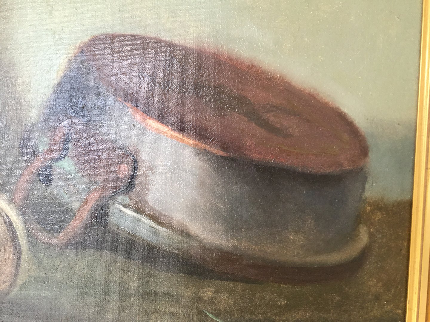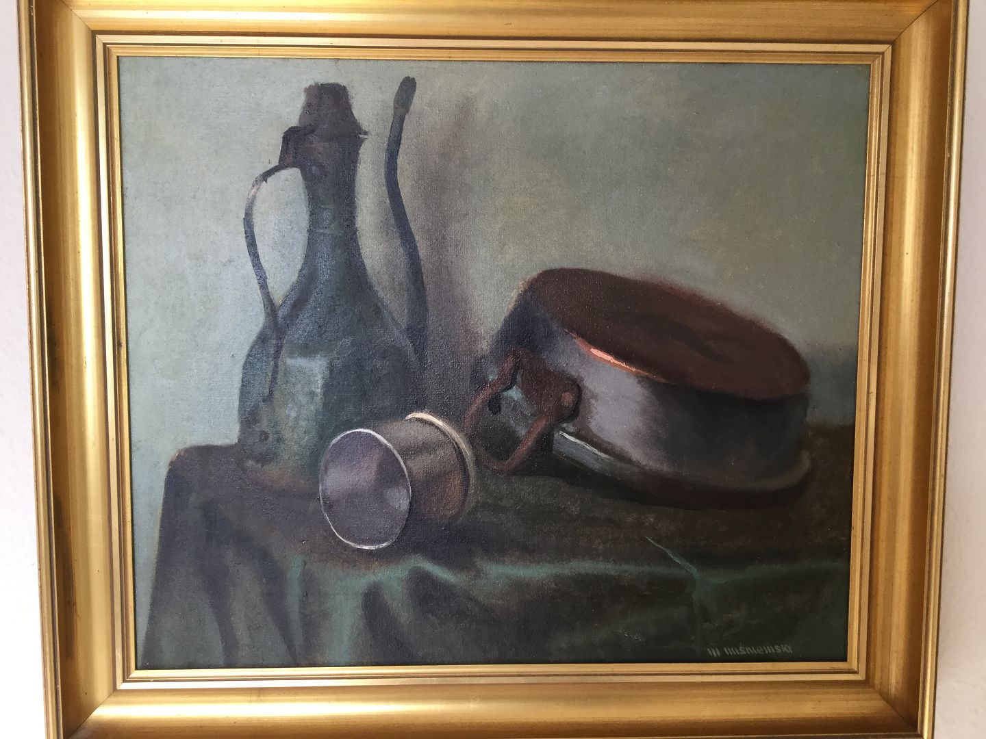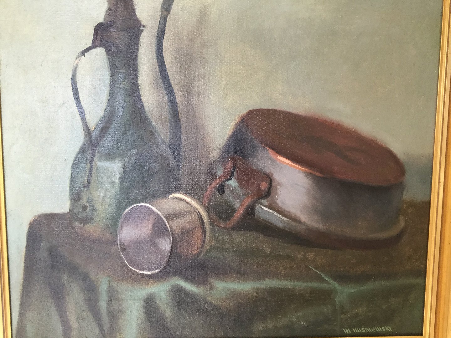 Maleri af Witold Wisniewski - Opstilling på bord med kobbertøj.